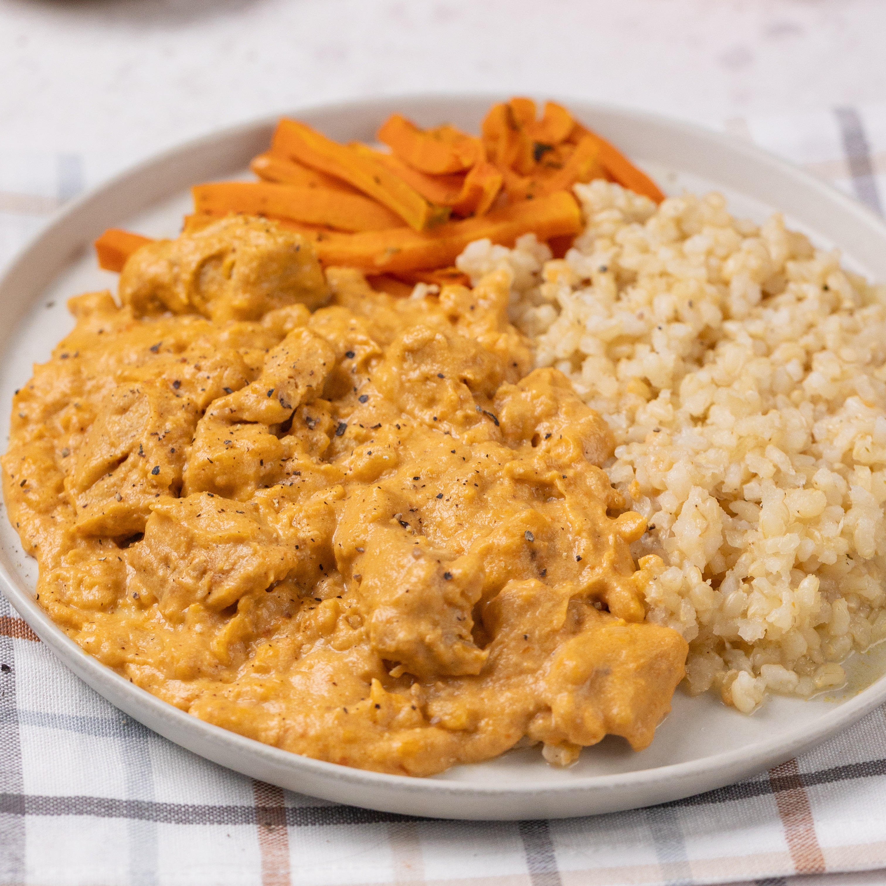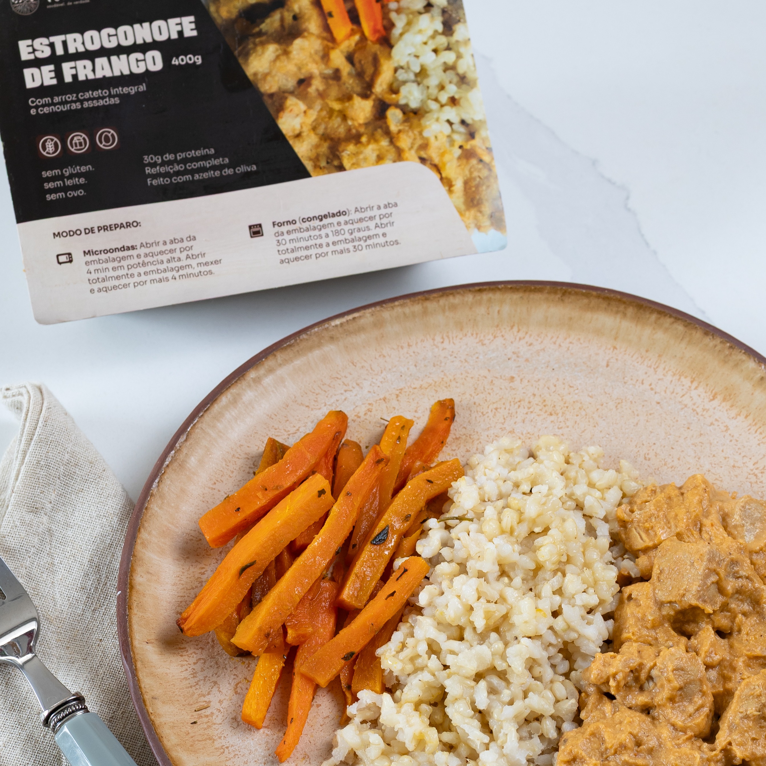 Uma refeição completa e equilibrada, feita para deixar seu dia mais gostoso e prático! Ele é feito com ketchup e molho inglês caseiros, para garantir um sabor único e artesanal. Acompanha cenouras assadas bem douradinhas e arroz cateto integral - essa refeição entrega o equilíbrio perfeito entre sabor e nutrição. Ingredientes: Estrogonofe de frango (peito de frango sem antibióticos, castanha de caju, tomate, água,cebola, azeite de oliva extravirgem, sal, vinagre de maçã, shoyo de coco, mostarda, cúrcuma, páprica, pimenta do reino, gengibre, cravo, canela, amido de milho e açúcar demerara orgânico), arroz cateto integral, cenoura e orégano. Alérgicos: contém castanhas. PRODUTO CONGELADO INFORMAÇÃO NUTRICIONAL: Porções por embalagem: 1 Porção: 400g (1 unidade de 400g) Valor Energético: 382kcal Carboidratos : 28g Açúcares totais: 5,6g Açúcares adicionais: Zero Proteínas: 30g Gorduras Totais: 18g Gordura Saturada: 3,5g Gordura Trans: Zero Fibra
