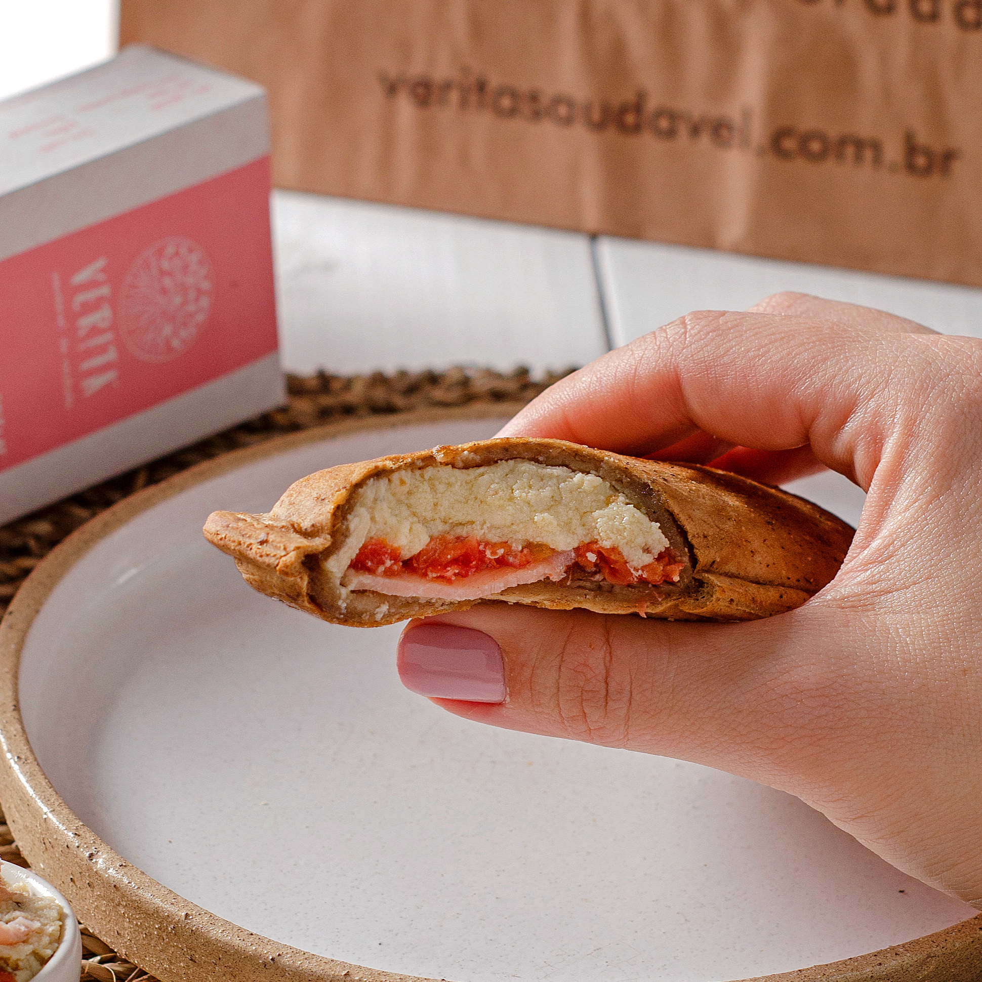 O Veritá é uma combinação de massa fina e macia, feita à base de aipim, batata doce e psyllium, com recheios ricos em proteínas, fibras e gorduras boas. É só aquecer quando e onde quiser para ter um lanche rápido, delicioso e saudável!