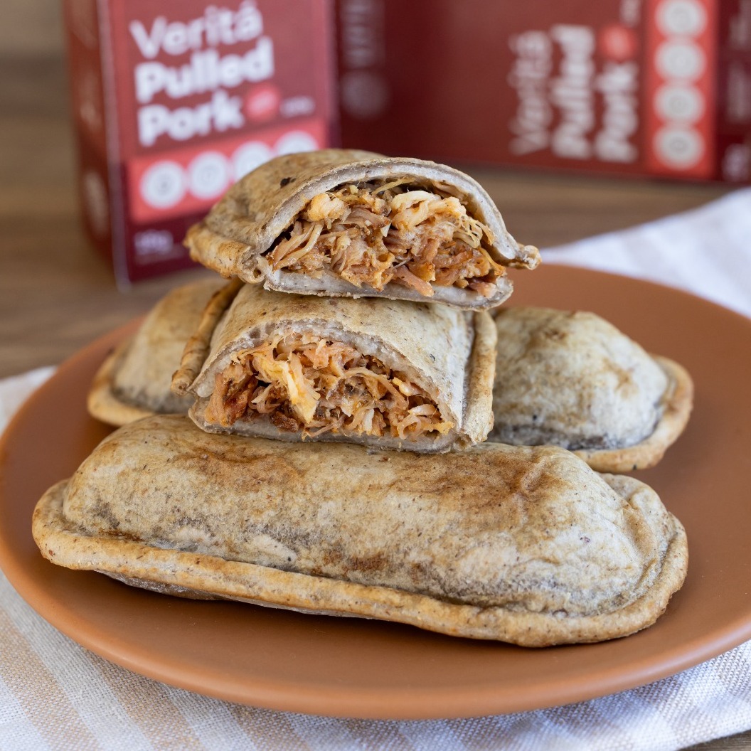 Uma explosão de sabor: Veritá Pulled Pork! Recheado com carne de porco desfiada, defumada e super suculenta, ele vem bem temperado e combinado com o toque irresistível do molho barbecue. Cada porção (120g) entrega 18g de proteína, garantindo muito mais sabor e nutrição em cada mordida! Ingredientes: Massa: aipim, biomassa de banana verde, farinha de mandioca integral, azeite de oliva extra virgem, psyllium, sal e goma xantana. Recheio: sobrepaleta suína, tomate, sementes de mostarda, vinagre de maçã, açúcar mascavo, suco de maçã, pimenta do reino, açúcar demerara orgânico, páprica doce, sal, páprica defumada, cebola em pó, alho, cominho, pimenta caiena, cúrcuma e canela em pó. PRODUTO CONGELADO INFORMAÇÃO NUTRICIONAL: Porções por embalagem: 1 Porção: 120g (1 unidade de 120g) Valor Energético: 285kcal Carboidratos : 18g Açúcares totais: 2,1g Açúcares adicionais: 1,7g Proteínas: 18g Gorduras Totais: 16g Gordura Saturada: 4,8g Gordura Trans: Zero Fi